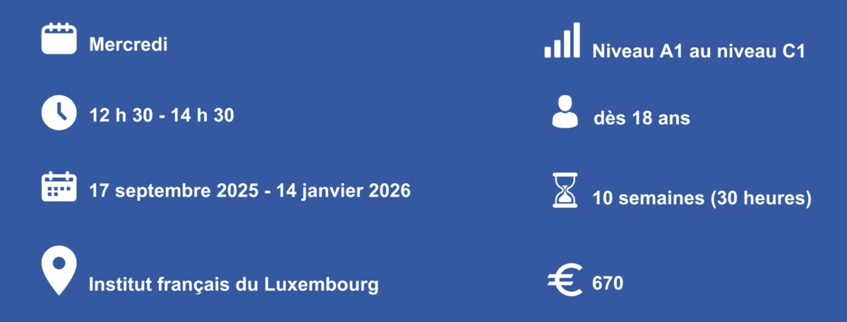 Les dates des sessions intensives sont hors vacances scolaires luxembourgeoises. Toute leçon initialement programmée un jour férié sera automatiquement reportée en cours de session.